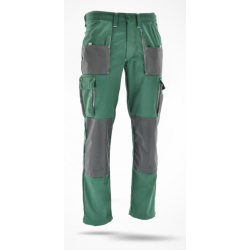 65% poliestru / 35% bawełny, 280 g/m2 Kurczliwość: 2-3% Rozmiarówka: Standardowa zapinane na guzik pasek i szlufki z tkaniny kontrastowej pas tyłu z wewnętrzną gumą do regulacji obwodu rozporek zapinany na zamek dwie wpuszczane kieszenie, wykończone lamówką wloty kieszeniowe z tkaniny kontrastowej kordurowe wzmocnienia kolan z miejscem na nakolanniki z kontrastową lamówką zamykane na rzepy na prawej nogawce tyłu kieszeń miarowa z tkaniny kontrastowej potrójny szew wewnętrzny i siedzeniowy nogawki wykończone obrębem rygle w kolorze lamówki